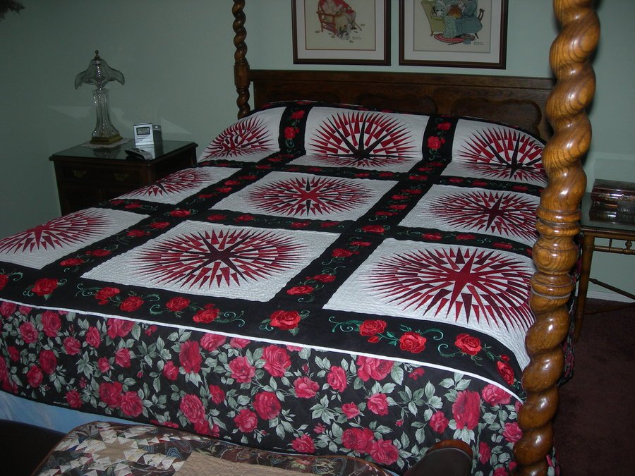 GRAMMERANN Rose Garden - Just put the final stitches on the binding. I started this nearly 2 1/2 years ago but have made others along the way. The original pattern has intricate applique on all the sashing and border, but I knew I could not achieve that so I opted for the machine embroidery instead. I decided to embroider on black since I planned to use the black and red border fabric. Hope you like it.