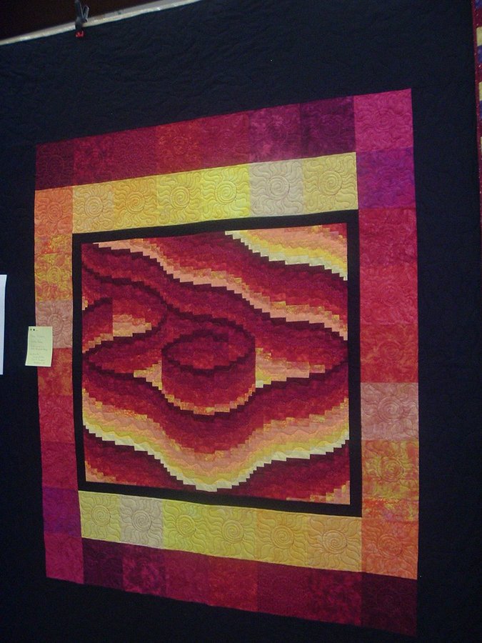 Core Inferno - I took this class with Ruth Blanchette on Quilt University. Of course, I am still in the 'mind frame' of bed sized quilts, so enlarged this using Bali Squares to border it out. I did free motion quilting with flames in the black border and Aztec suns in the bali squares. The center bargello was quilted to accent to movement of the bargello itself. Presented to my nephew and his new wife on the occasion of their wedding.