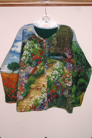 | Design Source - Description | Jacket made with a sweatshirt appliqued with floral and landscape fabrics. Like painting, fabric pieces were placed, then machine appliqued and quilted. |