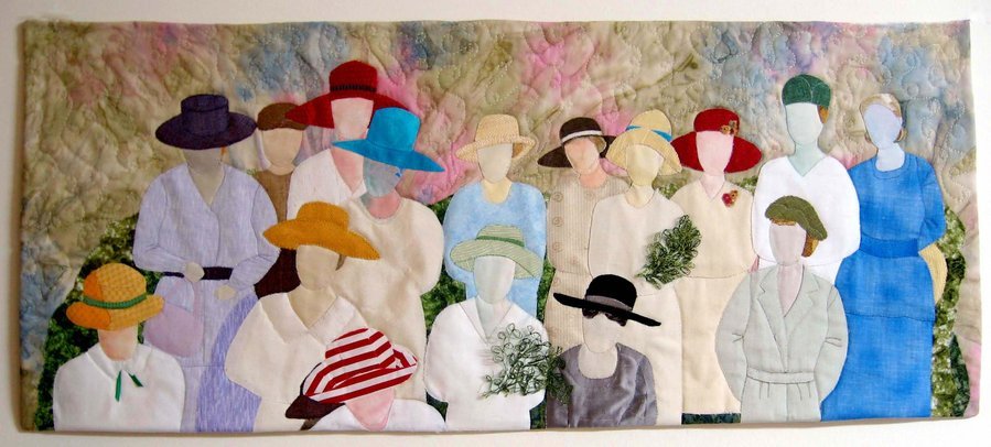 fibreart The Ladies - This piece is unique in that it evolved from a black and white photo of a garden party, taken probably in the 1920’s. What fascinated me most was all the hats worn by the women, so they became the focus of the design. Juried in to the exhibit "Edging Forward" held at Quilt Canada 2008.