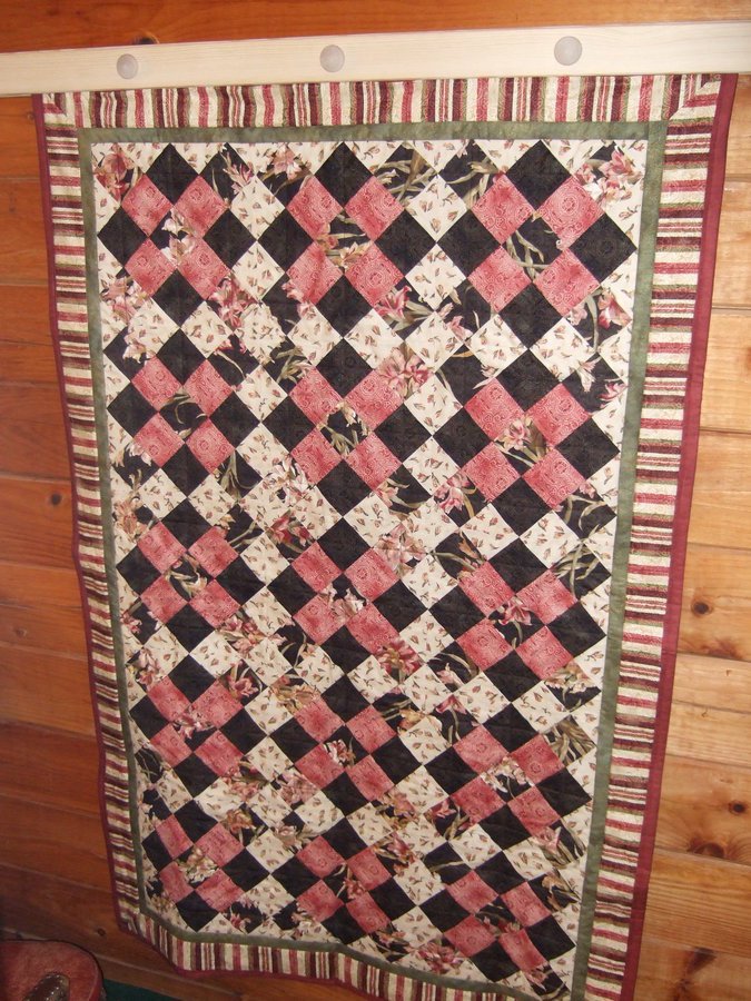 lolopass Classic 9 Patch - Made this quilt for my BFF as a christmas present using a stash collection that matches her bedroom. Created the quilt on Electric Quilt first to make sure I would have enough fabric for the quilt. Machine Quilted straight lines.