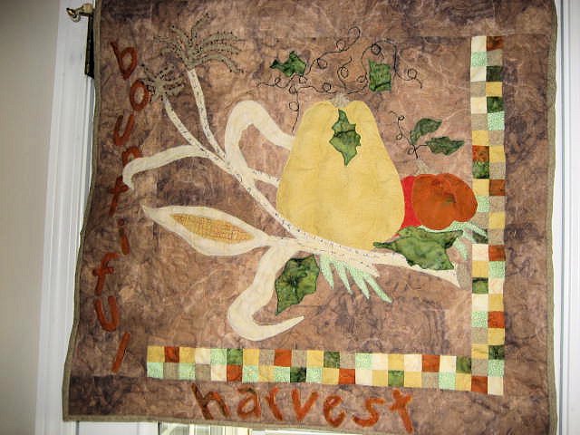 stitchpicker BOUNTIFUL HARVEST - Pieced and appliqued with batiks by machine. Added lettering as appropriate for gifting to my pastor. Added beading for emphasis on corn silks.