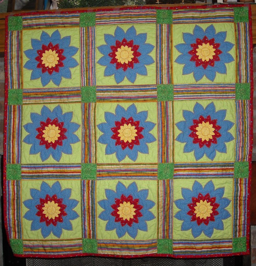 jpadden53 Bright Baby Flowers - Three layers of machine applique for flower in custom block and setting. Free motion quilting designs are custom and reflect the floral, fun theme. Bright colors on the front to stimulate the baby, soft flannel backing to soothe.