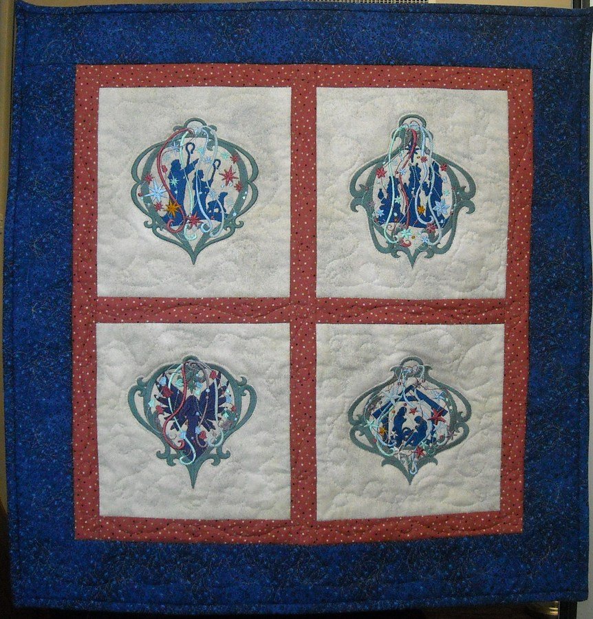 | Design Source - Description | Purchased embroidery patterns were used as blocks for this Christmas Quilt of unconvential colors. Custom free motion embroidery. This quilt hung in my office for the Christmas season and will return again in 2011. |
