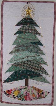 ConnieND Paper pieced Christmas tree - This was a challenge from a quilter friend in November 2006. She put her choice of fabrics into a bag and handed them out. I received a bag with mainly green fabrics. I had an aha moment and used a paper piece pattern that I have had for years. I was able to use muslin for my background and lame for the star. I embellished with machine stitching with metallic threads. also added beads and jewels.