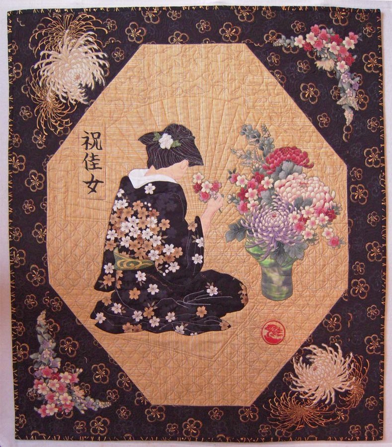 Sewdreamy Quiet Celebration - My 2011 Hoffman Challenge quilt. There are really too many flowers for a traditional Ikebana arrangement she is making, but it seems to work. I see her as a little older Geisha on a quiet day celebrating something special as she arranges her beautiful flowers. The Japanese characters say Celebrate beauty and woman or womanhood.