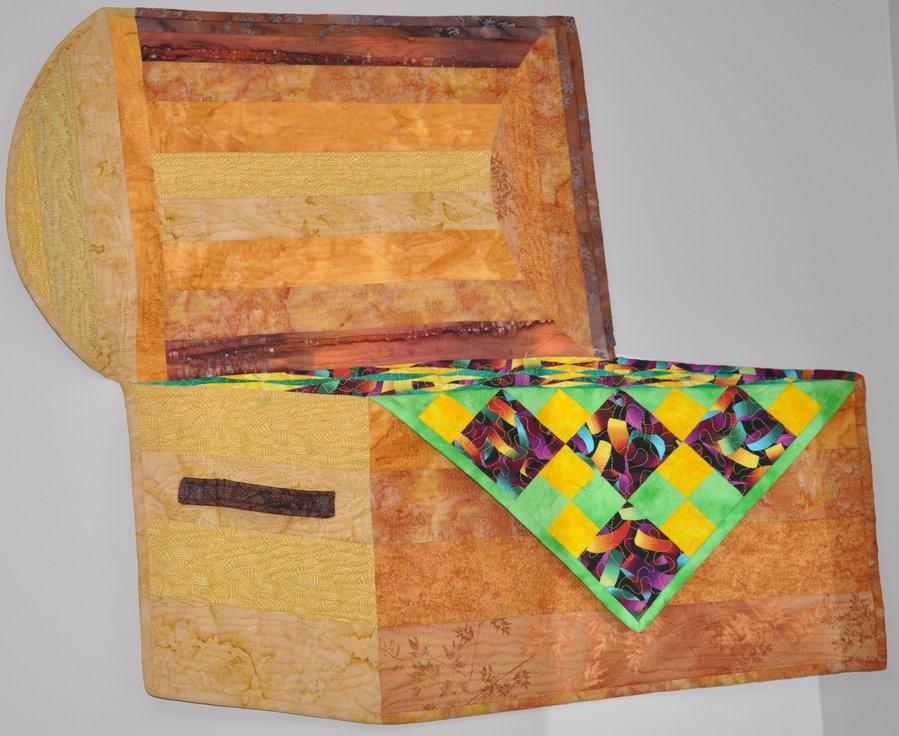 drblt Trunk Show - This quilt travelled in the 2005 Hofmann Challenge Show. The piece of "quilt" hanging out of the "trunk" is actually a flap of quilt that can be flipped up. The handle is also dimensional.