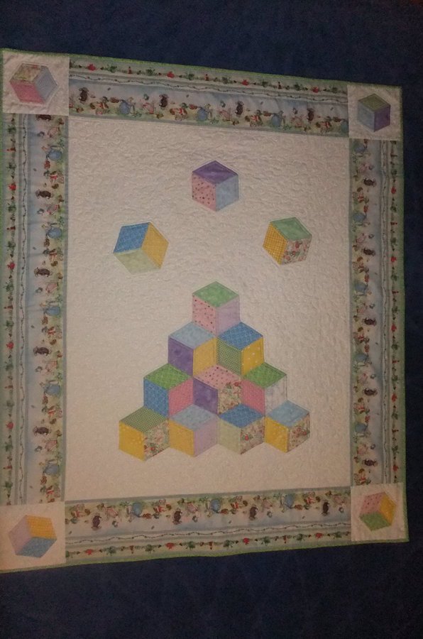 HelenEllice Ruby's Quilt - A quilt made for my dear friend's first born. I love to use tumbling blocks for babies quilts. The quilt was made from my many scraps from the countless babies quilts I have made over the last few years for 4 grandchildren and countless grand nieces and nephews. They can all stop breeding for a while and let me get some quilts made for me.