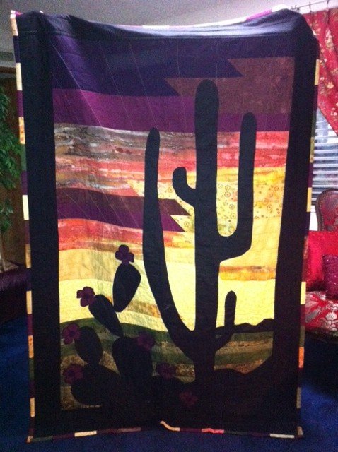 quiltfanatic Arizona Sunrise - A dear friend wanted a quilt depicting an Arizona Sunrise. I used an old technique of using color strips to make the sky and appliqued cactus by hand using the needle turn method. It was actually a very simple technique for such a dramatic effect.