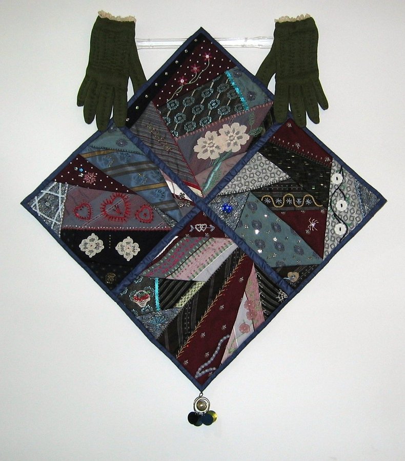 | Design Source - Description | Created from vintage neckties. Crazy quilt technique. Displayed by vintage gloves. |