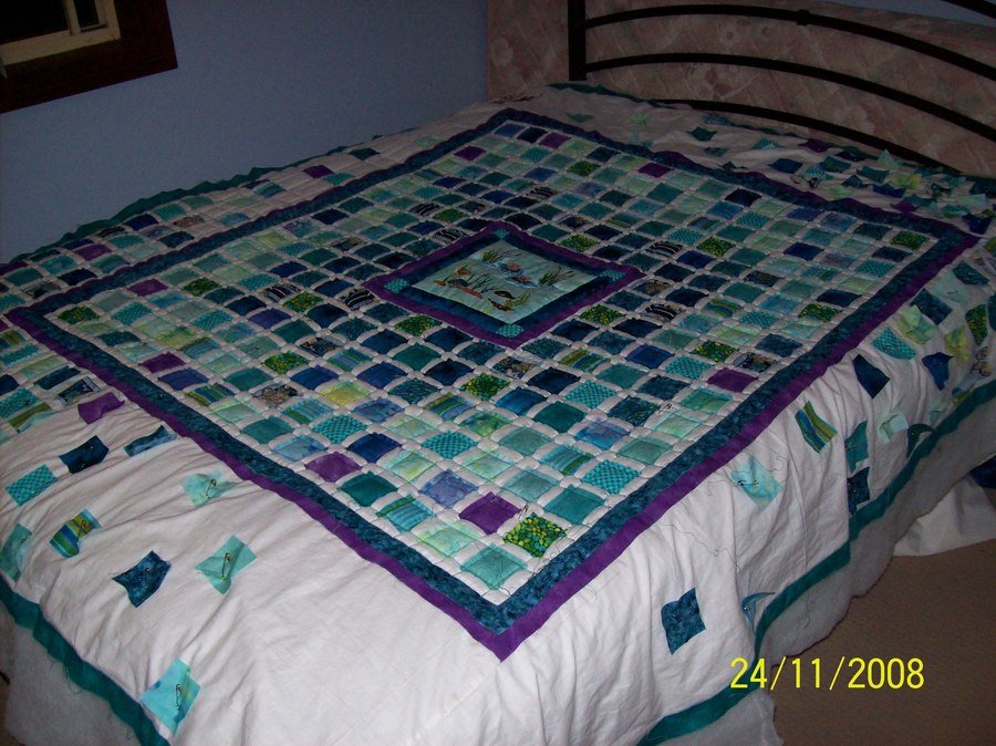 Mikany Colours of the Pond - quilt is a combo of machine embroidery and raw edge patchwork.