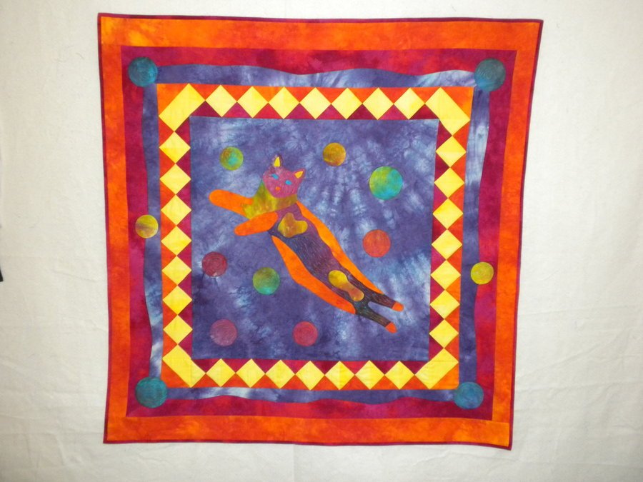 Katiezquiltz Batting Practice - I entered a 5 and only 5 contest by Ricky Tims. My cat is always playing with balls and this pose of her on the bed with her paws in the air looked like she was batting at something. I'm also a baseball nut. So it only made sense to me to combine both my like for my cat and baseball. The cat and balls are hand applique. The 1/4 square triangles were made using 1/4 ST paper. I wanted to try a curvey border and figured out how to cut and stitch the curves. Much of the quilt is stitch in the ditch with some free motion quilting in the larger areas. I met my goals of having fun, meeting a deadline and trying something new. Now to donate it to a cause or hang it on the wall in my home.