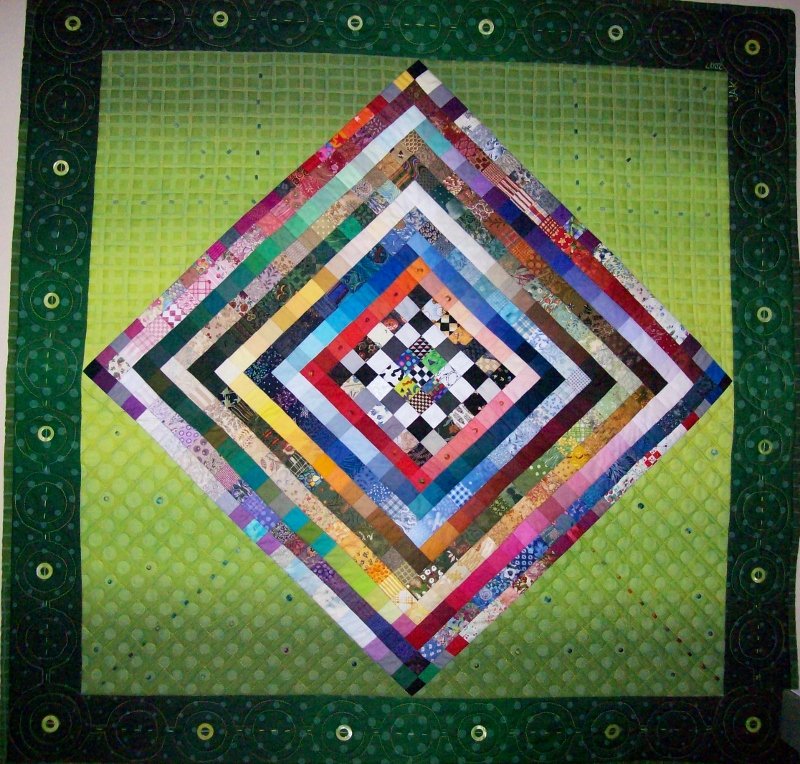 mamaja Green Around - This is how I used the little boxes of old fabric samples I had gotten from Keepsake Quilting several years before. Had fun arranging them, and then machine quilting and beading this one.