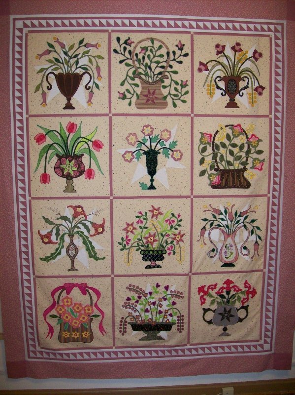 mamaja Bouquets For A New Day - Machine appliqued this quilt of the month with my own fabrics. Had the background left from a quilt I made for my Son and Daughter in law when they got married, so that made this one special for me. Many of the blocks were appliqued with my Bernina embroidery module and my Bernina software.