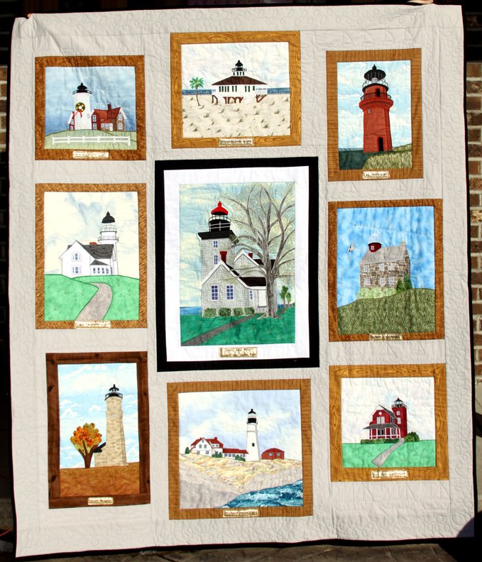 NancyAnn1959 Keeper Bill - My husband, Bill, likes to photograph light houses. For our 20th anniv. we spent the weekend in the keeper's cottage of the one in the center. I learned a technique for turning photos into applique. There are no fusibles. The photo is traced onto muslin. I finished it in time for our 25th anniv. All blocks are from his photos. I am entering it into my guild's quilt show, which is in May. Quilted by me on my regular Viking. Also entered into the Genesee Valley quilt fest show, a show with 600 quilts. It won Judges Choice. It was the favorite of Cyntjia England. I am so honored and thrilled that I also won $100!