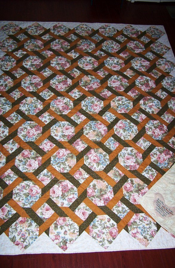 Quilt top was made in 2003 but was not put together and quilted until 2011. Quit is to be given to son and daughter-in-law for their 15 wedding anniversary Machine pieced and quilted on long arm maching |