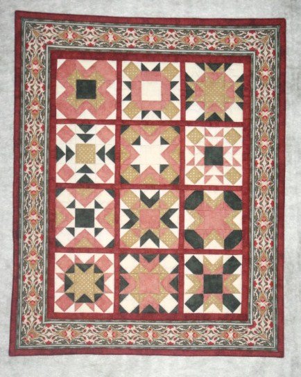 LVCindy Puzzle Quilt - One of my quilt groups (the Lone Mountain circle of Desert Quilters of Nevada) did a block-of-the-month with the traditional block, St George's Cross. We used the same block every month, just changing the placement of our four fabrics each time. This is a great study in the drastic differences that can be obtained by judicious use of color (and value!). I just can't resist going small, so I pieced my blocks at 3 inches. Thanks to Helen Baczynski for developing this project.