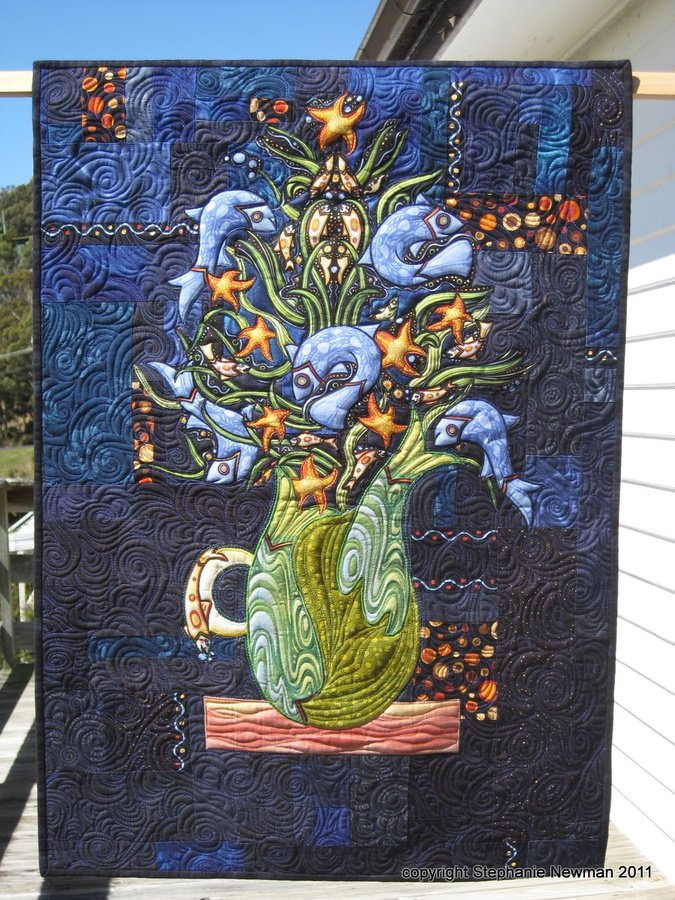 StephanieNewman Something Rather Fishy - Queensland Quilters Inc. Challenge 2011- I used the design elements of the mermaid fabric which required minimum 20% visible and added other fabrics to create the fishy arrangement-the jug's handle and spout are the mermaid's tail and fish! Touring for 16 months.