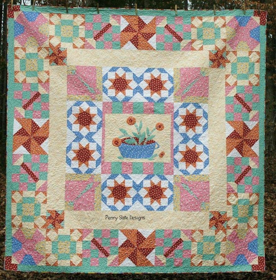 coboring Washtub Posies - This quilt is designed using authentic 1930's Kansas City Star patterns. I designed the medallion using my patented Press & Peel Pattern System. I especially enjoyed the quilting as the patterns include clothes pins, washtubs and butterflies.