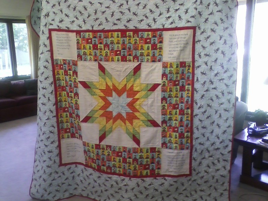 drj2athome sock monkeys and scripture for Shellie - Took me a long time to make, learning all the way. Couldn't have finished it without Local Quilt Shop for the binding and Member Cheryl Begg ? for the final quilting of the last border. She send me a link for a you tube video on how to make a quilting table with insulation to go around the machine which was awesome. Look for the link on forum for new quilters questions.