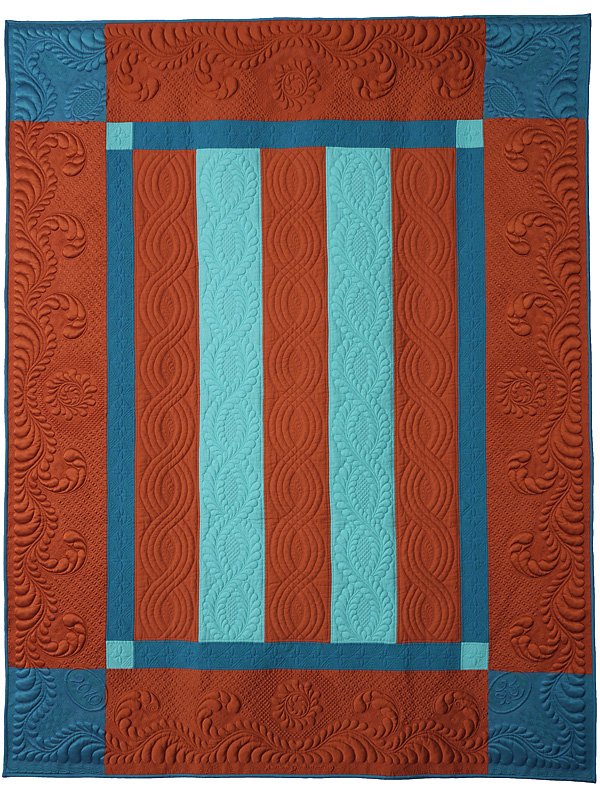 dflquilts Five Bar Blues - This quilt is based on one of my favorite traditional designs, the Amish 'Bars' design, and was a gift for myself. It is trapunto'd, layered with wool batting, and quilted with many different colors and different weights of silk thread, on my home sewing machine.