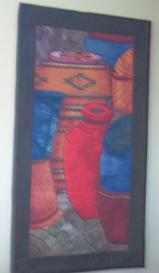 fabricfood Stacked Pots - Adapted pattern from photo taken by Eileen and started in a class taught by her at her shop. Pieces appliqued & quilted at same time, rough edge on black background.