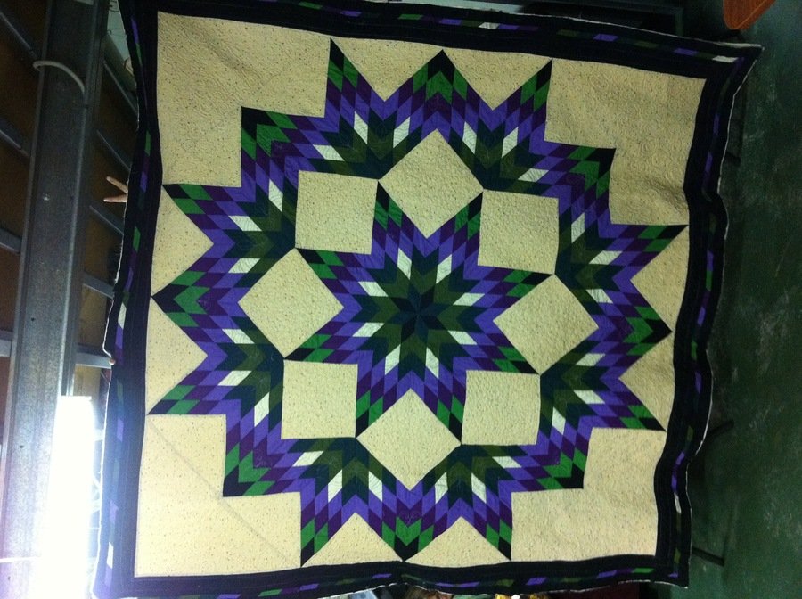 McKPwll Finally! - I created this quilt as a gift for my dear cousin Maureen, who I haven't seen face-to-face for over 20 years. And 20 years is about how long I've been promising it to her. I asked her the colors she would like used and I decided on the pattern and quilting design. It is completely hand pieced and hand quilted within the star and points. The quilting outside the stars are machine quilted.