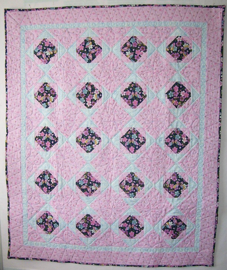 | Design Source - Description | I wanted to try this method of making the pineapple block. I used the center block for the main theme and was able to quilt butterflies in the secondary block that came about when putting the blocks on point. A gift. |