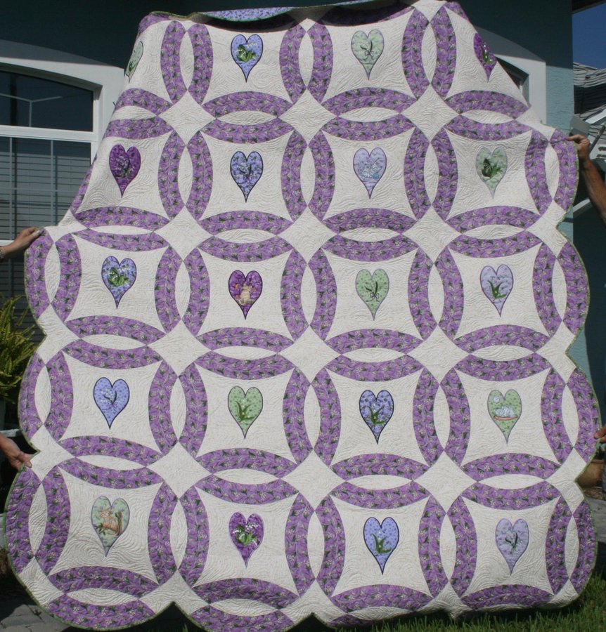 | Design Source - Description | This was a wedding gift for a friend the hearts are machine applique with machine embroidery in the middle of each of cats and Lily of the Valley. It is a queen size. |