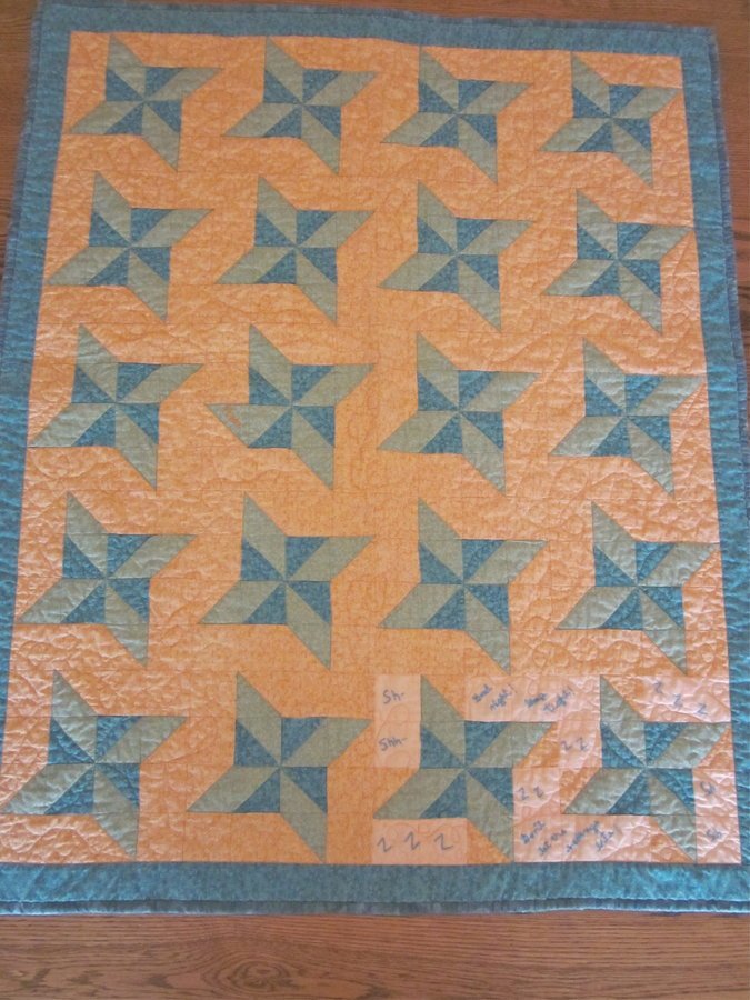 loise98 Good Nite, Sleep Tight - This is a baby quilt constructed for a church raffle for Kick-Off Sunday @ St. Paul's UCC 2000. My sister-in-law won the quilt so it is still in the family and all 8 of her grandchildren and some of my own have used it. It's a "good enough" quilt. Find the major "opps!" Also notice that I ran out of some of the fabric and used a close match and drew attention to that with a hand embroidered message "Sleep tight, don't let the bed bugs bite."