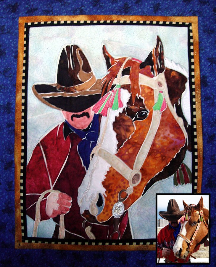 TerryE Dick & Sweetpea - I took a class from Sue from Dog Gone Quilts. She taught us how to make our own patterns fromour own photos.. What a fun class..This is from a photo (in corner) of my husband Dick and his horse Sweetpea. Dick has a antique cowboy hat on and Sweetpea has a 1920s horshair bridle on....What fun this was..