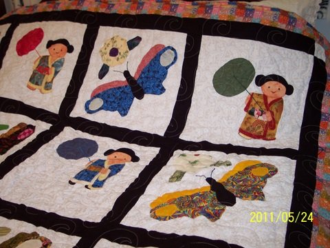 garrethsgran Butterfly's and Geisha's - I used the images from the pattern and revised to fit my own layout . The Geisha was a small image I found and made a template in order to piece dress. Hand appliques, machine embroidery stitches. Eyes and mouth were applied with Micron markers