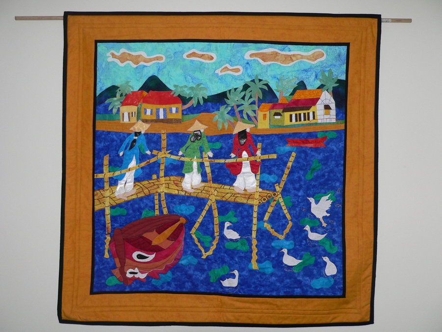 pruey Impressions of Vietnam - When we visited Vietnam in 2007 I was inspired by the bright colours local artists used. When I returned home I made this naive art style quilt with raw edge appliqued cotton fabric. It is evocative of many scenes we were to see and experience in Vietnam.