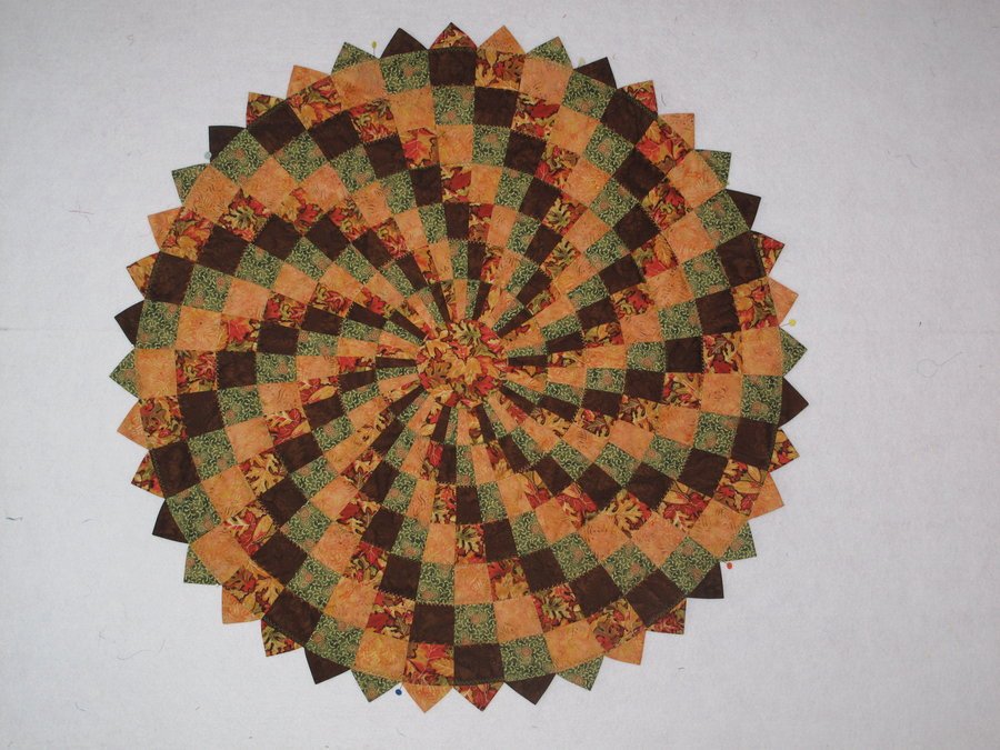 MaryRinWI Whirl-A-Way - My friend Evie asked for a "fall" table mat for her circular table. I had purchased a 10 degree wedge ruler and had been waiting for a chance to use it, and this fit the bill. I adjusted the directions and added the optional prairie points to make the needed size.