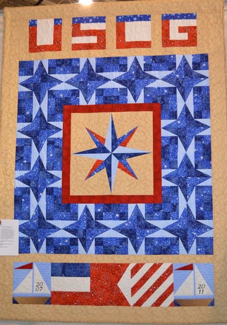 cjbeg Fair Winds and Following Seas - This was made for a coast guard cadet that Kim and her family sponsored. Glitter Metallic was used on the stars, the three blocks in the bottom center represent Jay's name, and the sail boats have the dates that he entered the academy and graduated. The Mariners compass is surrounded by the stars to guide him through his career in the Coast Guard.
