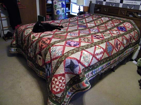 SalApril Step Back in Time - It took me 6 months to complete the blocks for this quilt, a couple more months to put it all together, then I finally quilted it in June. Eleven months from start to finish. Most of the fabric in the blocks were from my stash and scrap bag. The fabric for the sashing, setting squares and backing were purchased specifically for this quilt. The blocks were all done using paper piecing. I chose a different layout than the book suggested. I wanted the blocks to stand out more as individuals. I searched for what to do on the border, then I saw the flying geese and knew I found it. Laurie Aaron, the author of the book, did an awesome job.