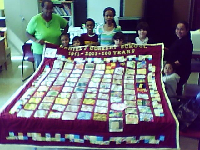 chicagoquilts Corkery School 100 years - Was asked by the school to create quilt for their 100 year anniversary. Kids donated 6" squares. I designed and created a queen-size quilt in about 3 weeks time. This was a record for me, it even included shopping for all notions and fabric, transfer paper. Some squares were to bulky to quilt so I scanned and transferred them to muslin.