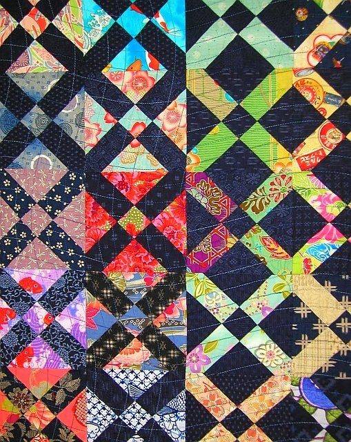 AnitaGrossmanSolomon Old Italian Block Quilt (detail) - A detail of quilt. I included unifying Japanese indigo fabrics throughout. Because of the cutting technique used many backgrounds appear to be fussy cut, but they aren't.