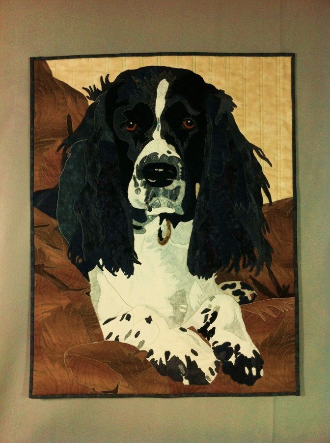 carolad Roxie - This dog caught my attention on Facebook and I asked the owner's permission to make an art quilt of her English Springer Spaniel Roxie. I thought this dog had the most soulful eyes as well as beautiful markings.