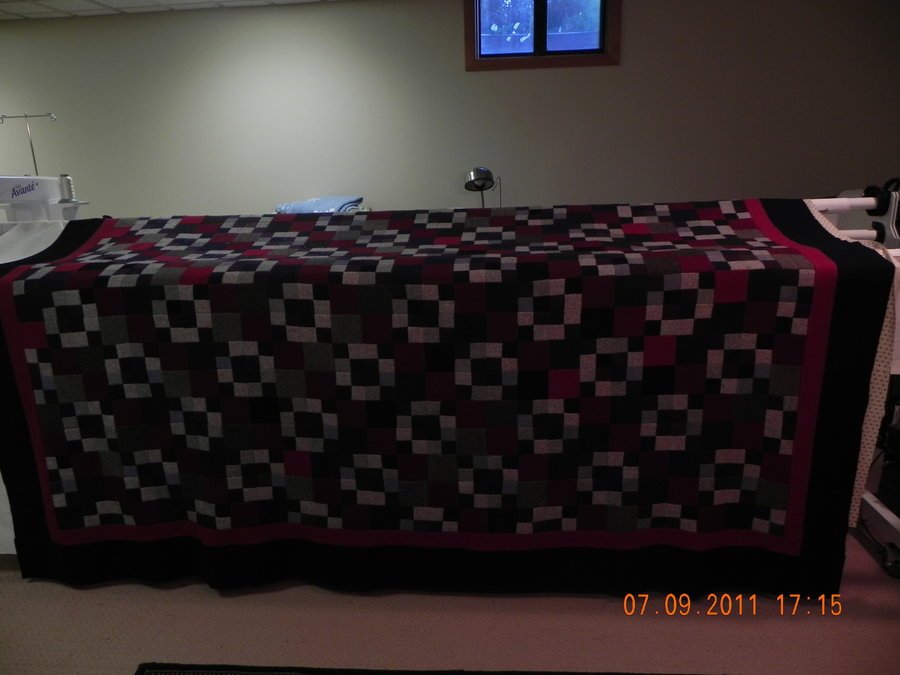 MaryVal Winter Night - This is a 100% wool quilt made from wool garments purchased at the Goodwill stores. I did buy wool yardage for the borders. This is a gift for my husband: because he asked for a wool quilt. Backing and binding will be a black flannel with a narrow red pinstripe running through it. I will quilt it with a large crosshatch and make a medallion design in the center 4 patch areas surrounded by the gray pieces. Red border will have the same medallion design - maybe a sunburst - and final black border will be a 1" crosshatch.