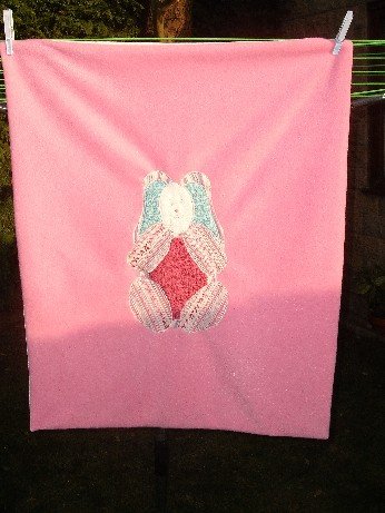 Gorfy Bunny Cot Quilt - reverse - The original design had the bunny on the front but I quilted hearts on the front and backed the quilt with fleece and appliqued the bunny design on the back.