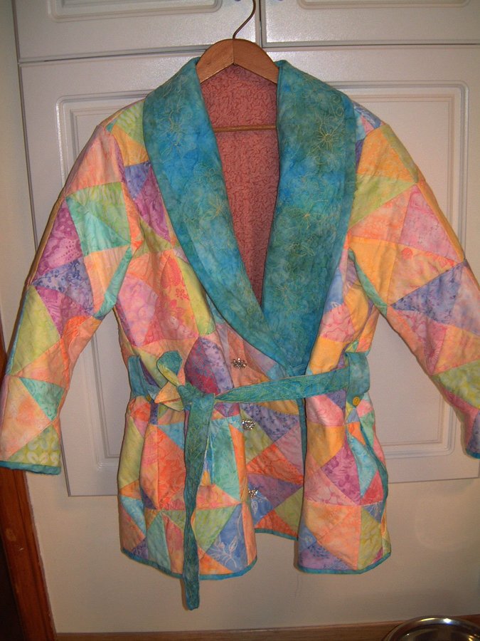 DebbieMac Quilted jacket - I used 2 rolls of pre cut %100 cotton squares. Those I cut into 4 triangles to make the quilt blocks needed for all of the jacket pieces. I originally added an entire inner layer, quilted sandwich as I wanted the inside all fulled quilted, however, once completed, it was way to heavy and bulky. Decided to just keep the quilted collar. Added the shinny buttons and made a closure, added a tie belt as the pattern did not include a belt. I think it came out very nicely.