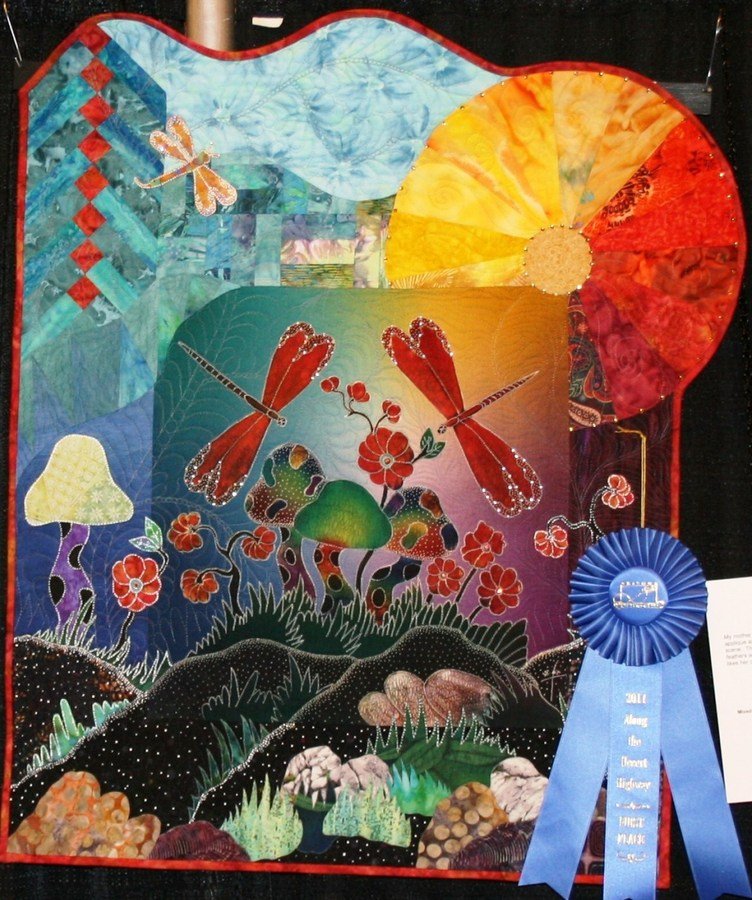 lynnk50 Dragonfly Mushroom Haven - I started with a batik panel. I added to the traditional blocks around the top of the panel to create a skyscape and applique to extend the design at the bottom. I quilted it with free-motion feathers. I added crystals to hi-light the dragonflies wings and the Dresden Plate sun.