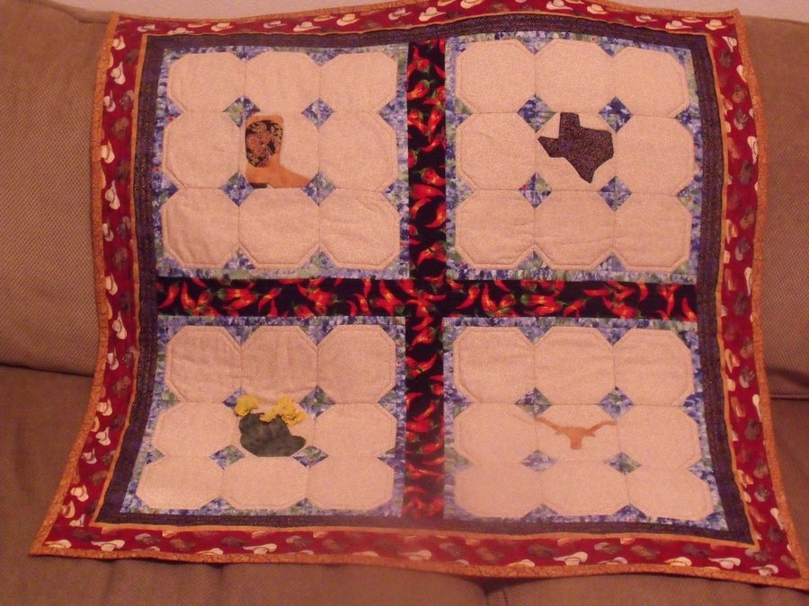 slozano Texanese - A friend of mine commissioned me to make this wallhanging for her brother's new mother-in-law who lives in Japan. She wanted a Texas theme in wallhanging size, since the homes in Japan are quite small. I designed this wallhanging to incorporate Texas theme items using Texas theme fabric and some Asian fabrics. The blue in the corners of the blocks and small border is bluebonnet fabric and the sashing between the blocks is chile pepper fabric. I was pretty happy with the way it turned out and my friend's MIL was thrilled to receive it!