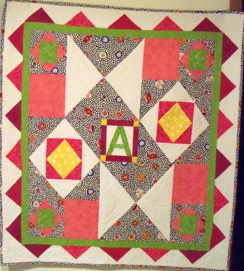 LORIM Avery's Quilt - knew the baby's colors would be brown and pink - found the PERFECT brown patterned Kaffe Fassett print so used to pick the other colors. The angles were "weird" so I had to use templates for the big angled pieces. Went together pretty accurately except one of the angled piece's tips is "off" but it's not really noticeable after the quilting was complete. This is probably one of the first truly flat quilts I've done, with no buckling or waviness on the edges. The "A" is paper pieced.