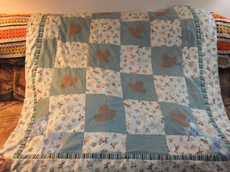 tiaabeja Cowboy hats - I made this quilt from flannel given by a neighbor. I make four patches and then put them into squares. I appliqued cowboys hats on the blue four patch. The cornerstones on the border have Woody from toy story embroidered on my Brother Quattro machine. I gave the quilt back to my neighbor.