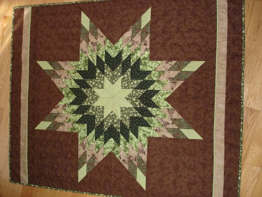katherinequilts StarLeo - I did the Quiltsmart small lone star with bear and other brown and green fabrics for our second California grandchild Leo. I added stripes at the top and bottom to give it the look of the now antique wool striped quilts my brothers had on their beds as children. I like the back as well as the front because it has that look in the crib