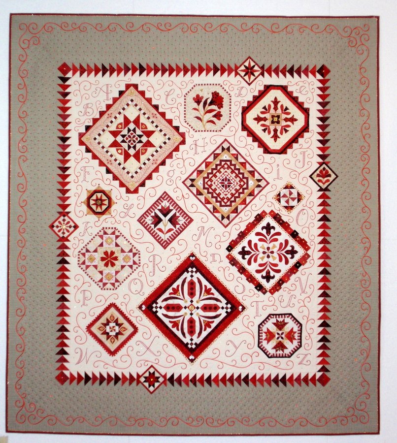 janetstone Red Letter Daze - This quilt was inspired by antique Quaker cross stitch samplers. The letters and scroll designs were all free motion embroidered. Lots of crystals, beads, and gold filigree pieces adorn the quilt. (I just love a few sparkly things!) I finally won a REAL Best in Show at MQX East this year with this quilt!