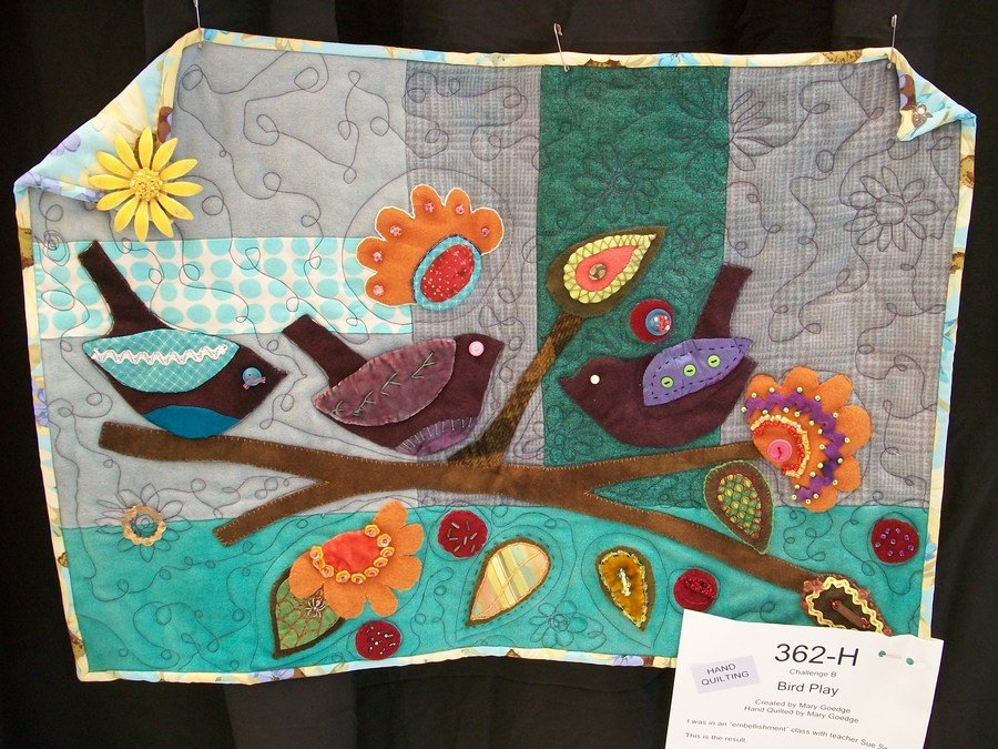 Momcatmary Bird Play - I went to a quilt store and saw a kit with beautiful wool for an upcoming class. The background is grays and turquoise. There is a brown tree branch with three birds on it surrounded by berries, leaves and flowers. Besides wool, there are velvet, silk and cotton fabrics. There is also lots of embroidery, buttons and beads. The quilt store is also a bead store.