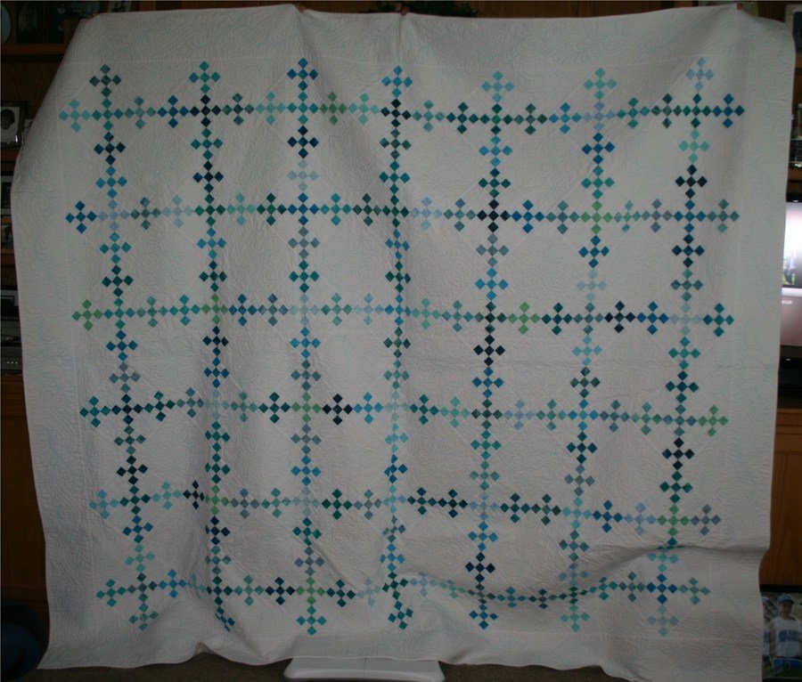 jamonty Wedding Day - I saw an antique quilt hanging in the Hoover Presidential Library Museum, West Branch, Iowa, during a field trip for my daughter in the fall of 2010. She turned to me and said "Mom, that would be a good quilt for Ben and Jennie but in "Jennie" colors." The original was red and white and a bit smaller than the queen sized one I made them. The wedding was June 2011.